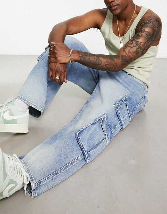 Unisex Multi-pocket Cargo Jeans in washed blue