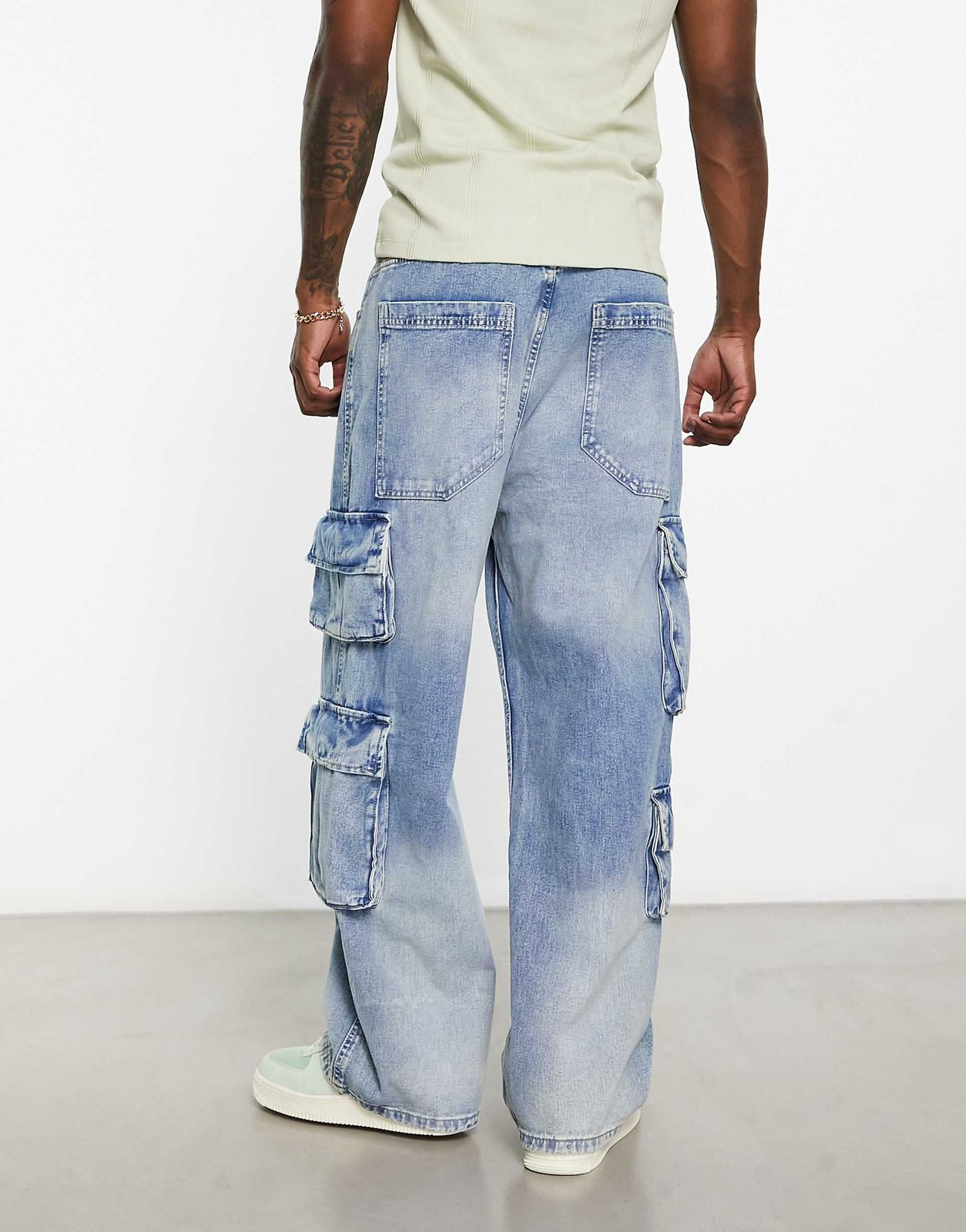 Unisex Multi-pocket Cargo Jeans in washed blue