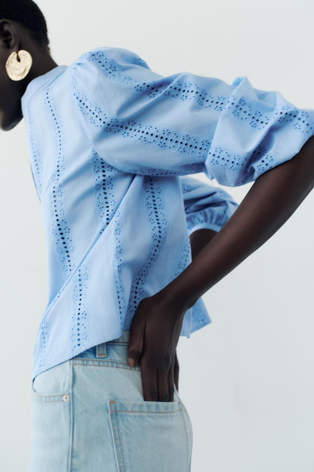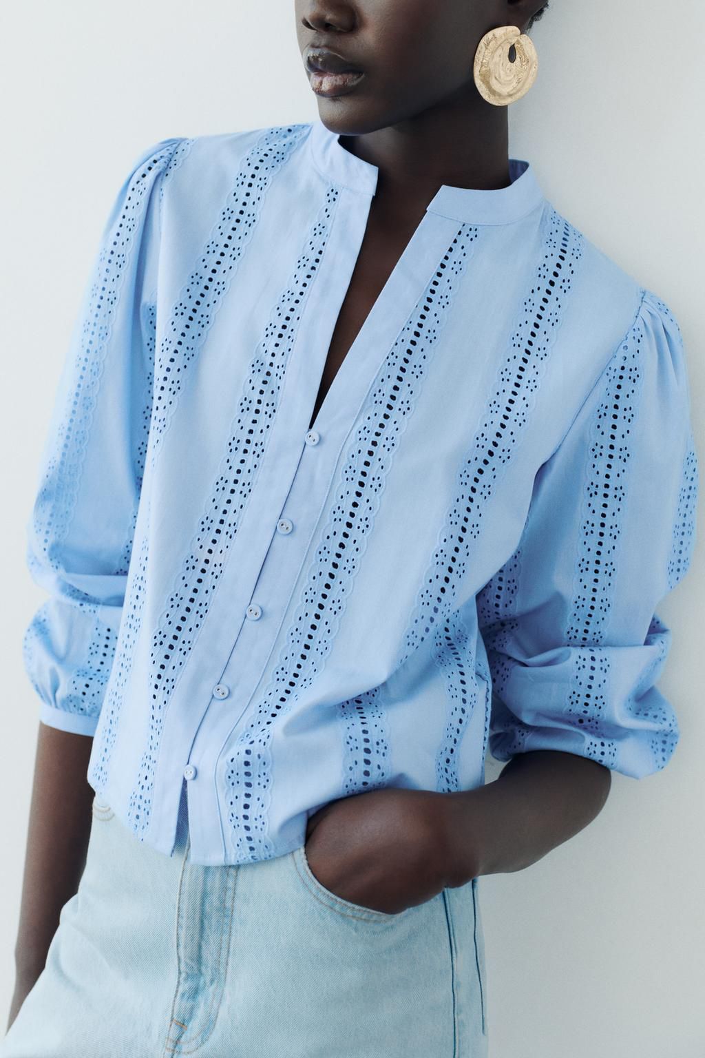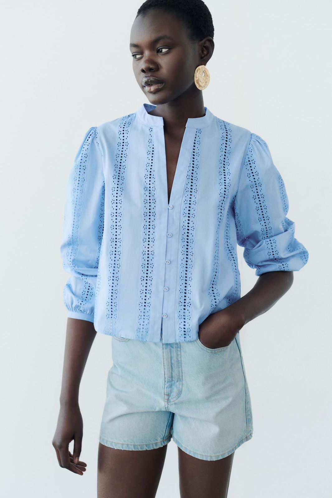 • Design: Vertical lace insert embroidery stripes throughout the front and sleeves.