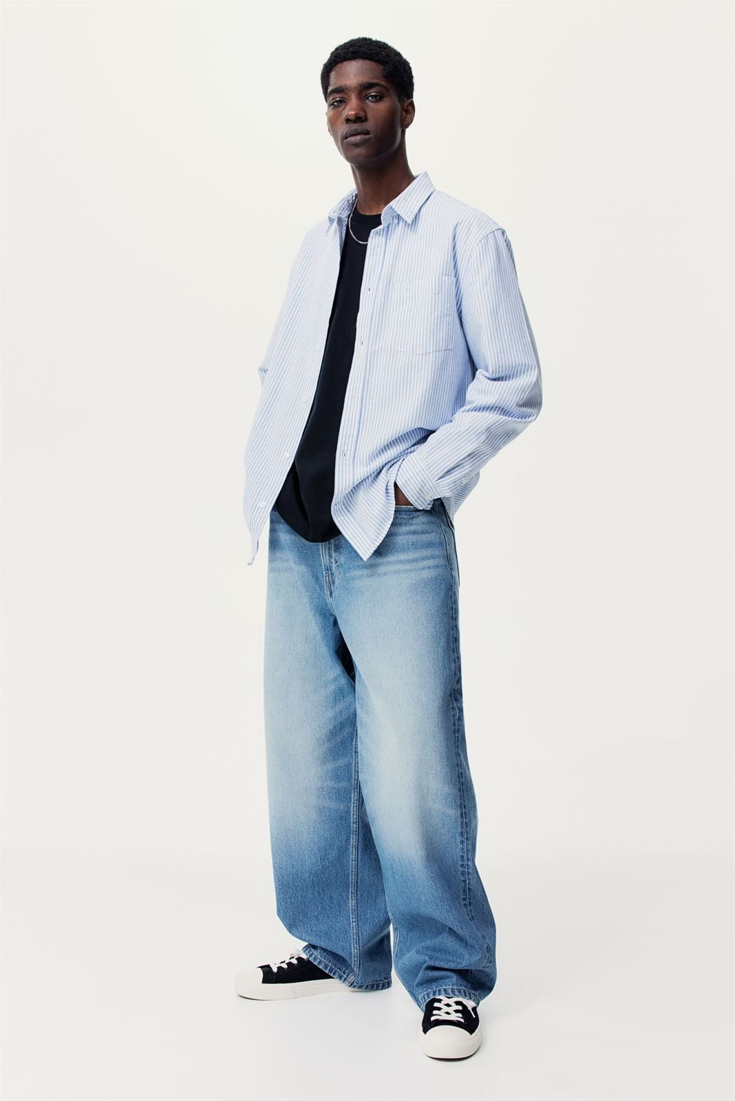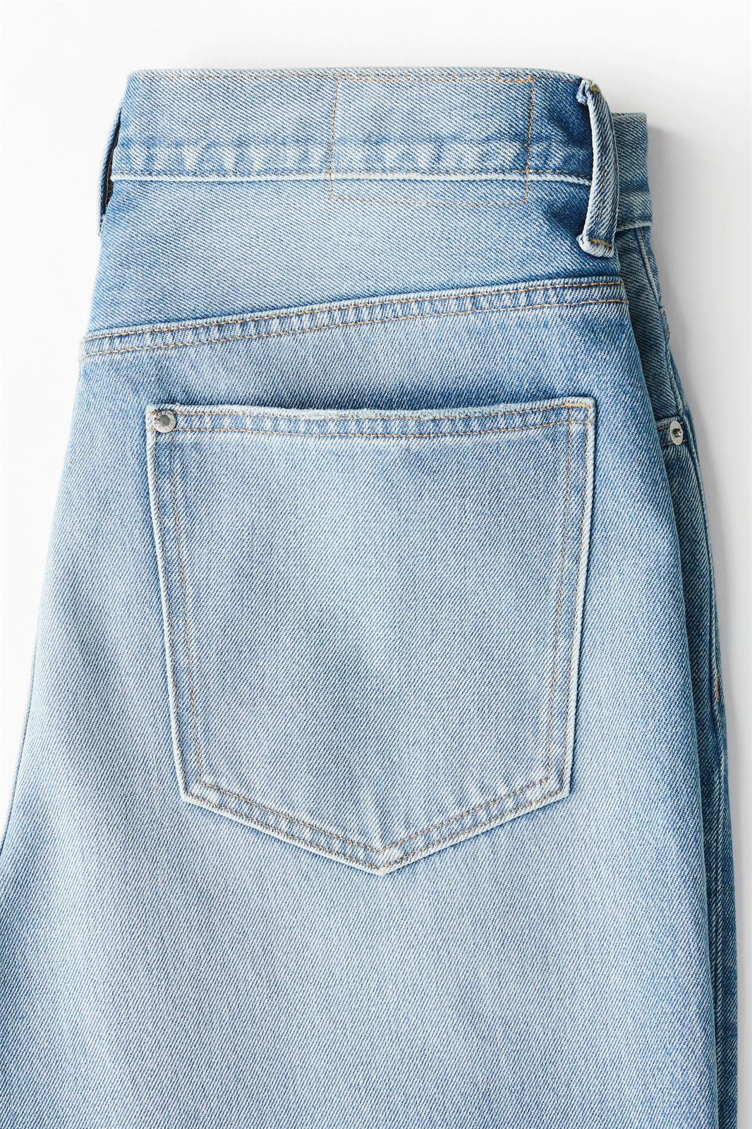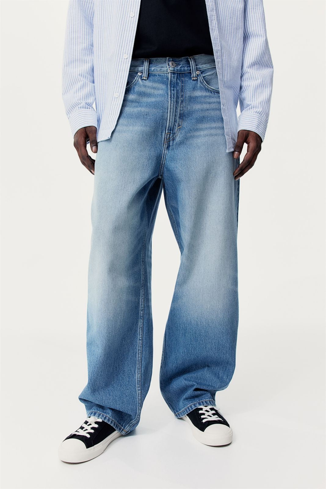 These jeans have a casual, comfortable, and modern aesthetic. The high-waisted, wide-leg cut is a popular contemporary style, and the faded, classic blue wash makes them a versatile wardrobe staple.