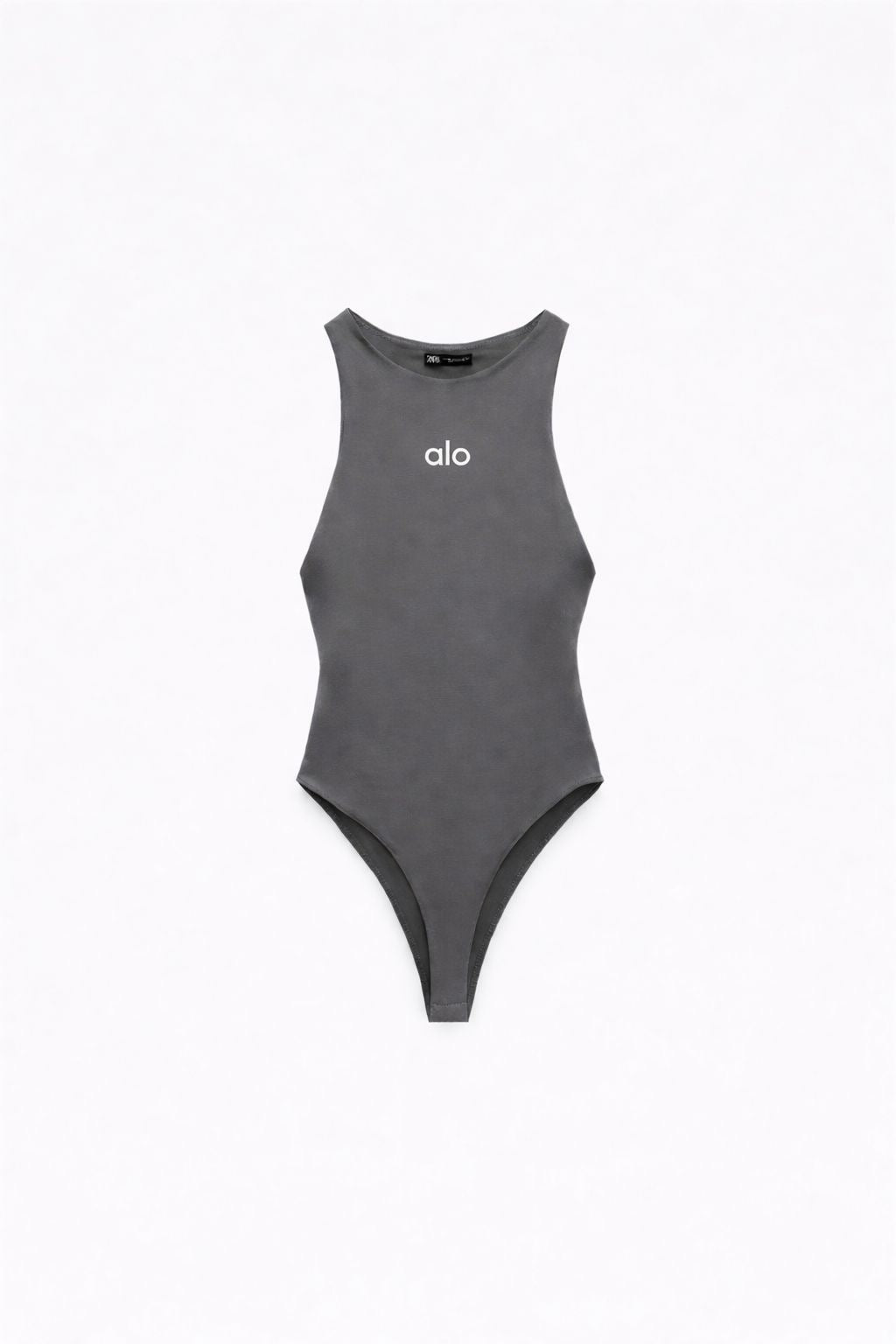 A minimal high-neck bodysuit in a sleek slate grey tone, featuring a fitted silhouette that contours the body. Designed with wide shoulder straps and a smooth, sculpting fabric that offers a snug yet comfortable feel. The subtle “alo” logo at the center adds a premium athleisure touch. Perfect for workouts, yoga sessions, or styling with cargos, denim, or oversized joggers for that effortless off-duty look.